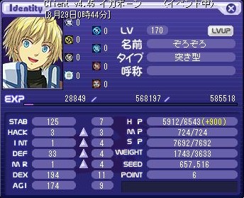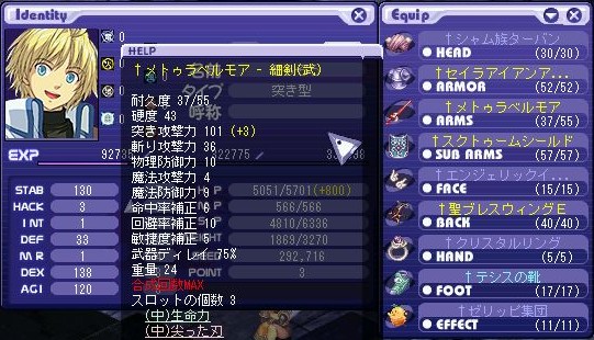 LV:120 STAB 110 HACK 3 INT 1 DEF 33 MR 1 DEX 120 AGI 117