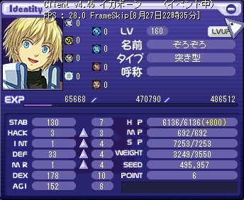 ステータスはこんな感じ・・・DEX30ぐらい一気に上がらないかな。