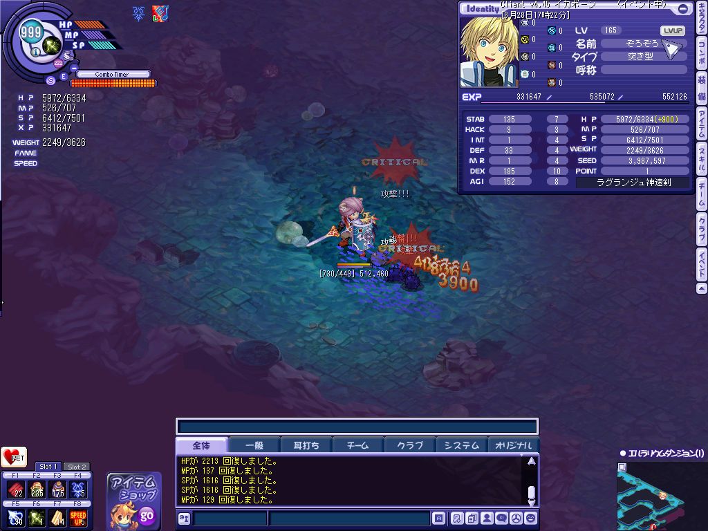 やはりこの場所はレア一発で大金が手に入る装備が出るので、狙う人が多いということ。もうひとつは僕のような人が多い。さらにLv150-の公平が多い、ということです。